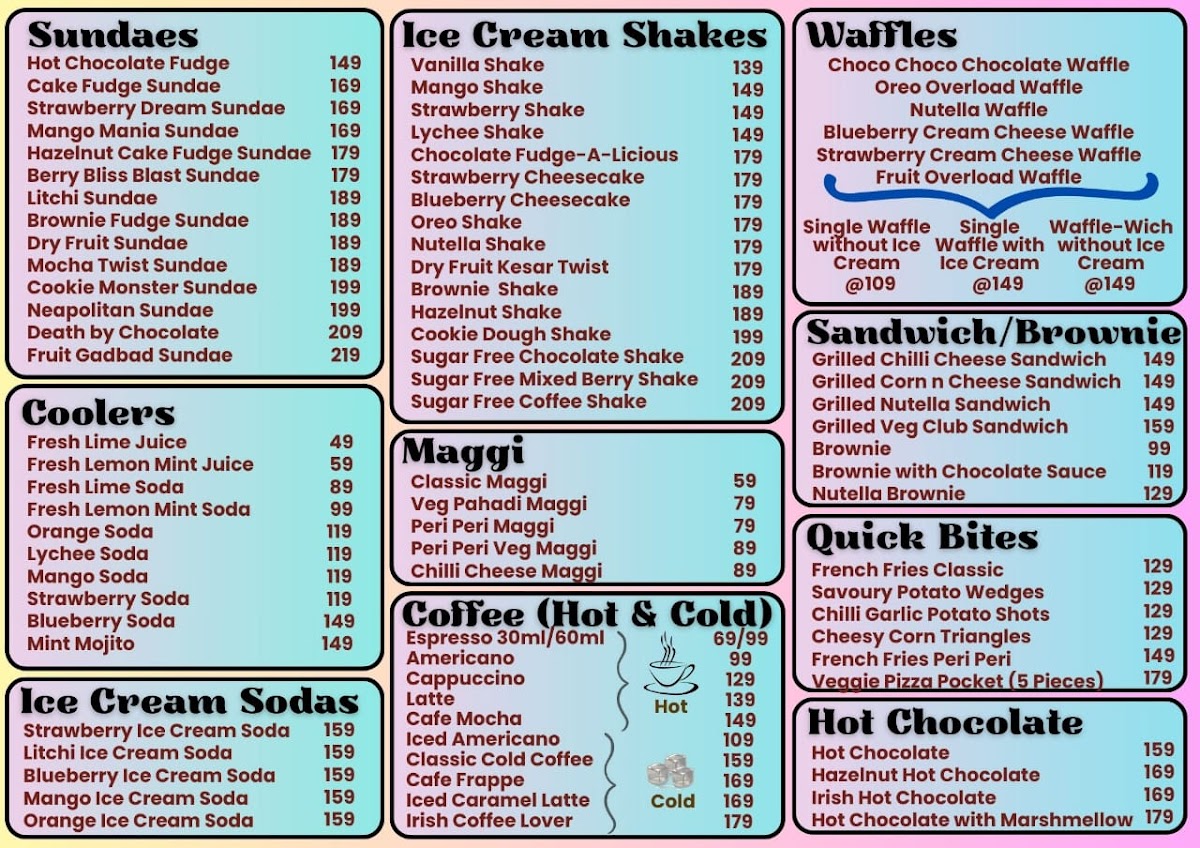 - Sundaes: Indulge in the decadence of their Death by Chocolate sundae for ₹209, or opt for the fruity surprise of the Fruit Sundae Gadbad for ₹219, where fresh goodies meld into a delightful concoction.
